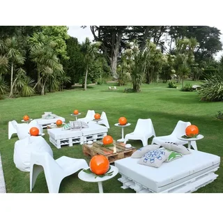 - Sofás chill out para exterior: Cómodos y resistentes, perfectos para crear un espacio de descanso en cualquier evento.